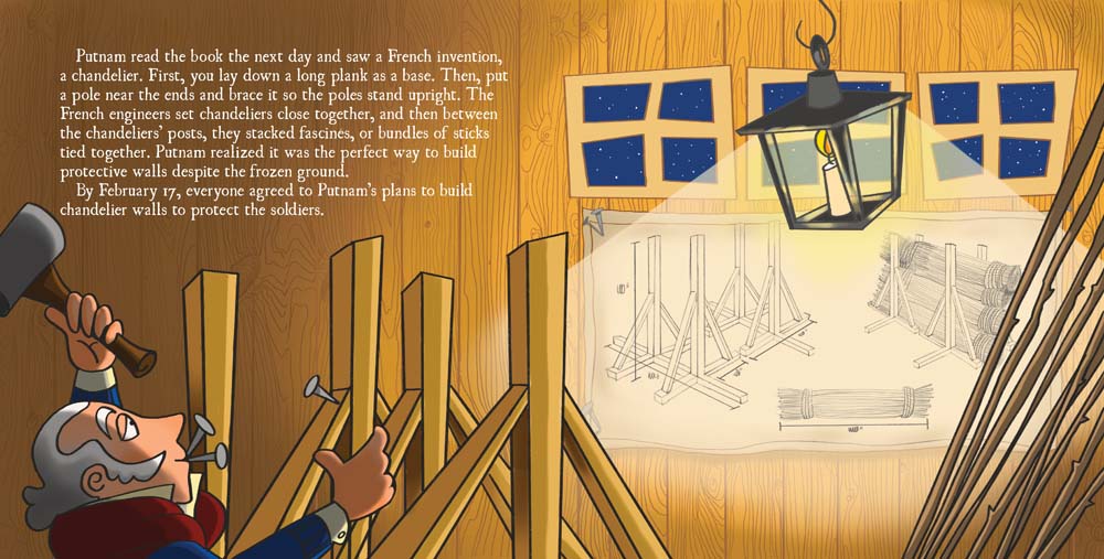 It was a cold winter, though. No one could drag cannons up Dorchester Heights without being seen. Washington asked Rufus Putnam, his army engineer, to create a temporary wall to protect the army as they moved the cannons into place. New England, though, was frozen solid and no one could dig in the ground till spring. Putnam had to figure out how to protect the troops without digging anything.